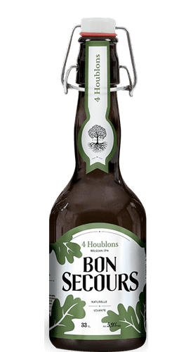 Bon Secours 4 Houblons es una IPA belga de perfil ligero y carácter amargo. Se elabora con las cuatro variedades de lúpulos Nogget, Centennial, Cascade y Belma, añadidos mediante Dry-Hopping. Estos le aportan su característico aroma y sabor. El resultado es una cerveza belga agradable e intensa al paladar con notas cítricas y frutales. Esta cerveza se ha elaborado mediante métodos tradicionales de forma artesanal con el objetivo de preservar los sabores clásicos de la cerveza. Además no está filtrada ni ha sido pasteurizada. Todas las cervezas de la gama Bon Secours se envasan en botellas con tapón mecánico.