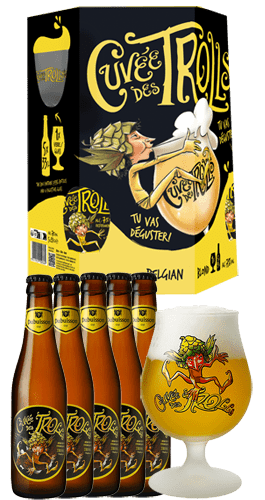 Pack que incluye 5 cervezas belgas Cuvee des Trolls 33 cl y un vaso original.