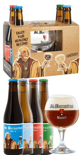 ¿Estás buscando cerveza para regalar? Este pack de cerveza de abadía St. Bernardus es el regalo perfecto para cualquier amante de la cerveza belga. Contiene 4 cervezas St Bernardus (1x Prior 8, 1x ABT 12, 1x Wit, 1 Tripel) y una copa diseñada especialmente para su degustación de 33 cl.